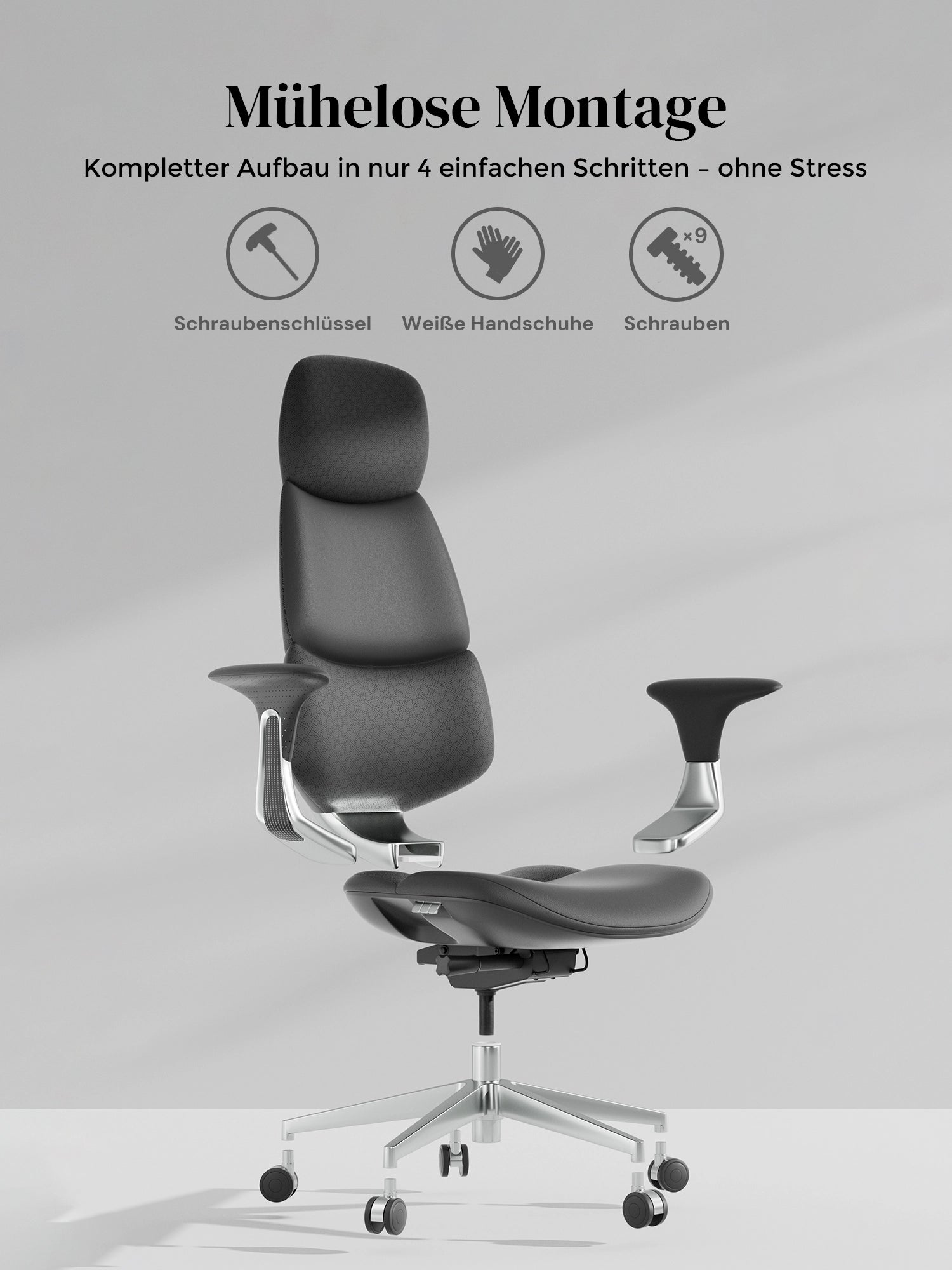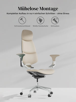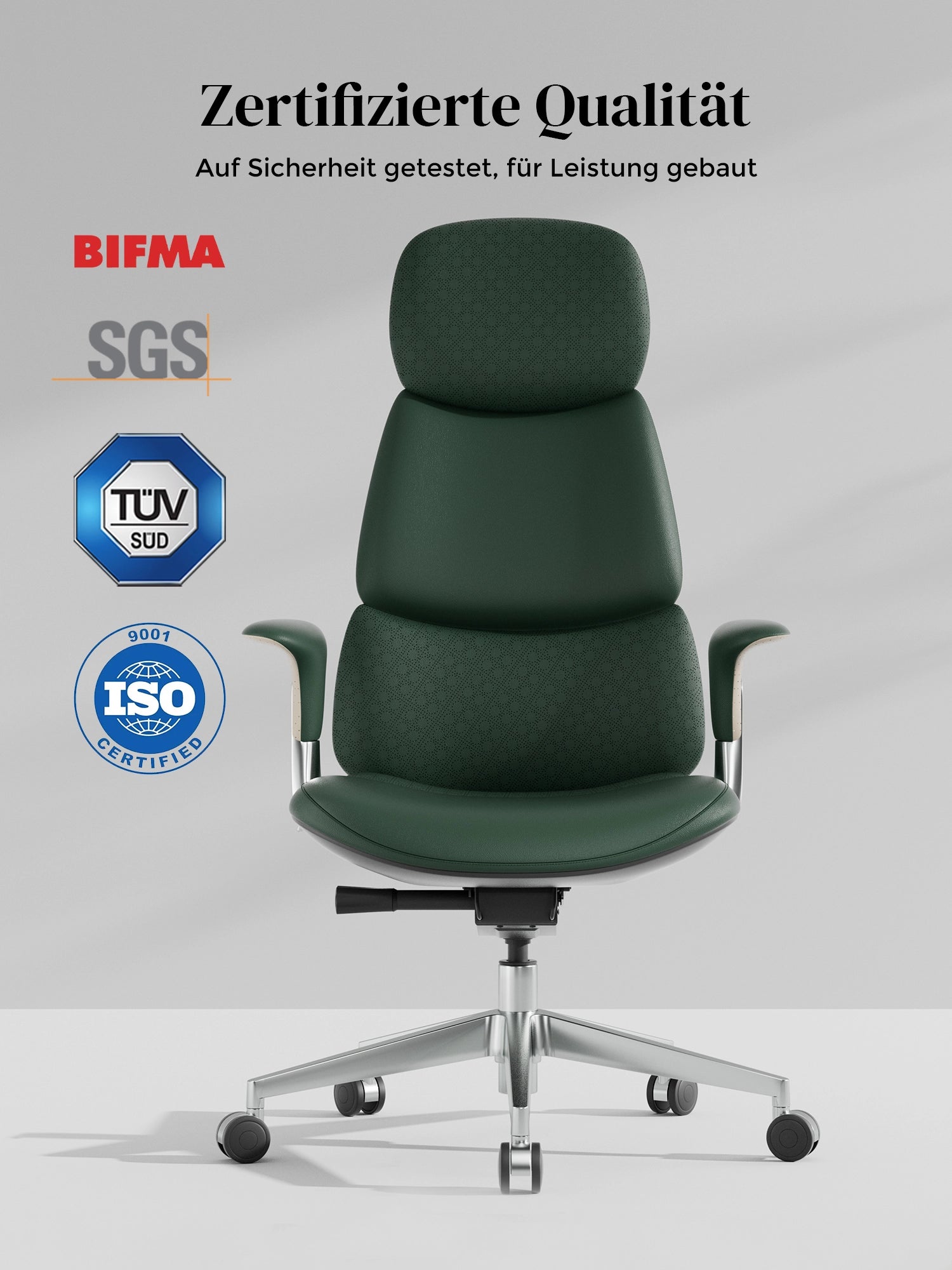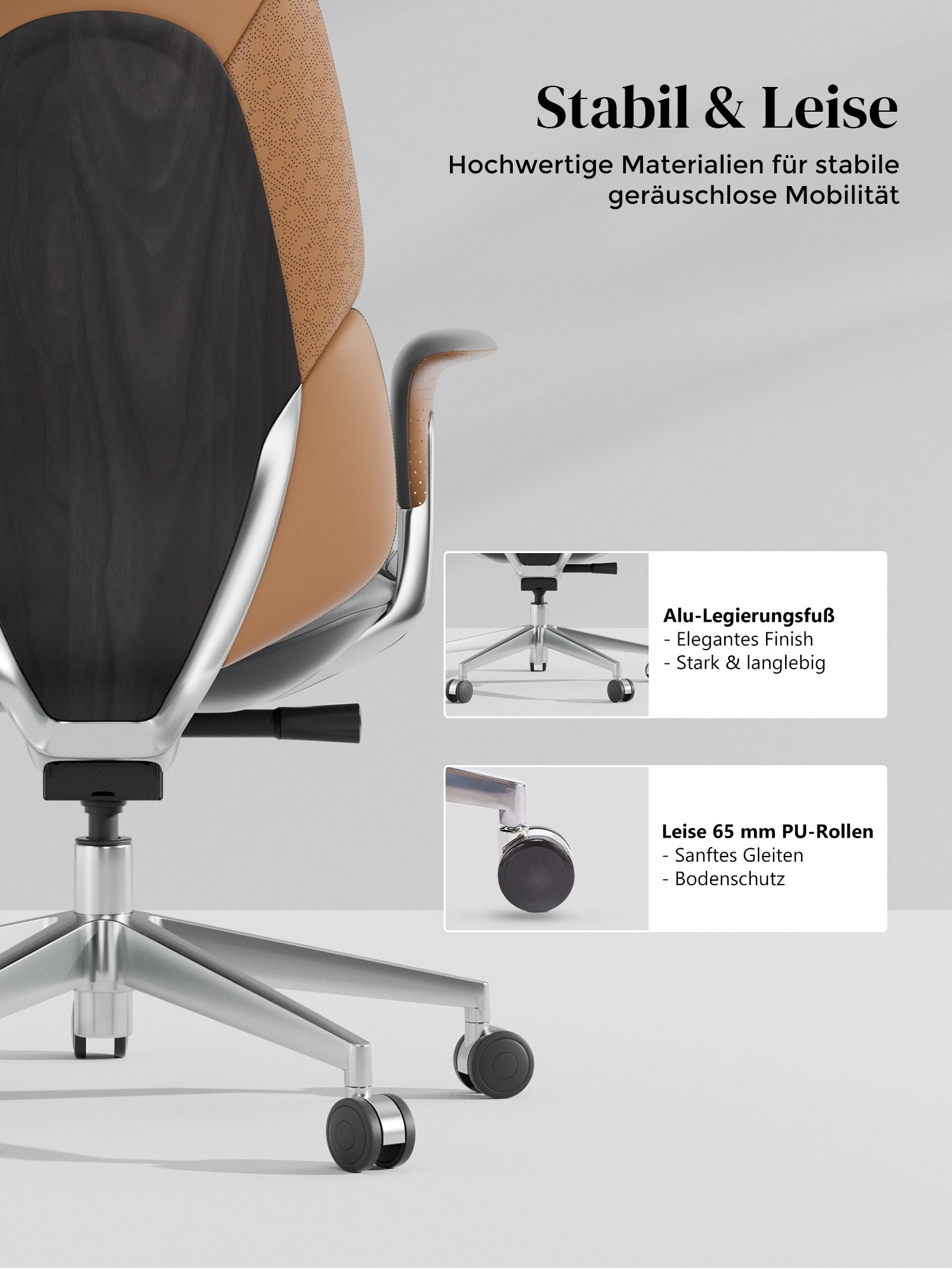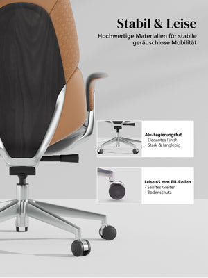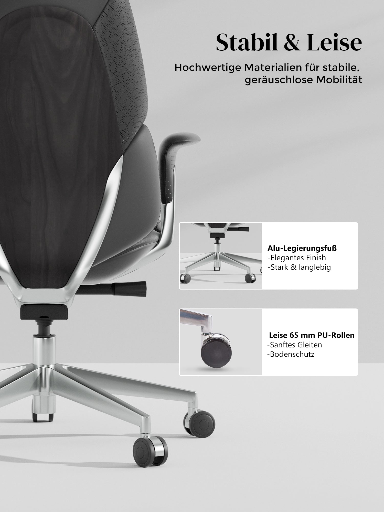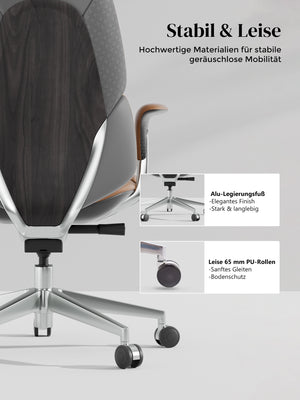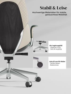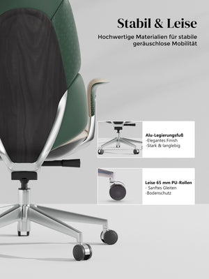 · Rollen: Hochwertige, halb aus Aluminium gefertigte Silent-Rollen, zertifiziert nach SGS / Greenguard Gold / TÜV-geprüft, ergonomisch