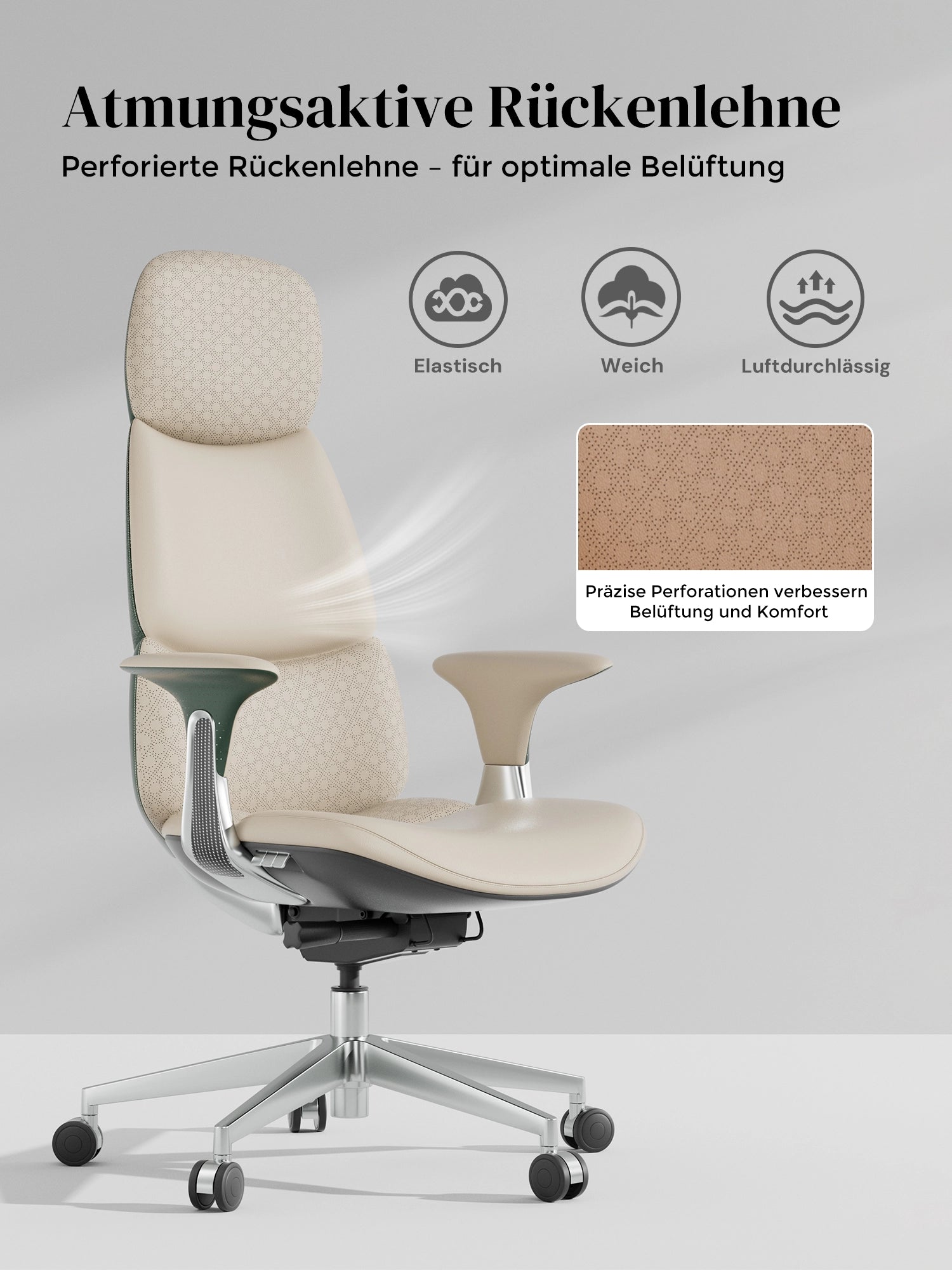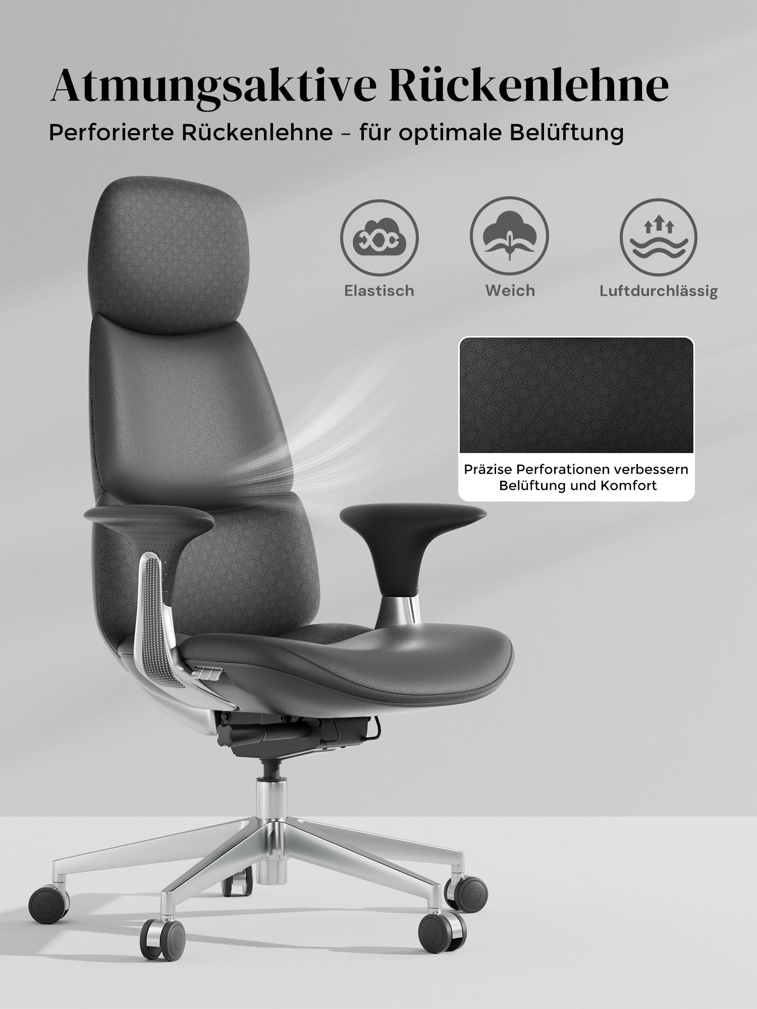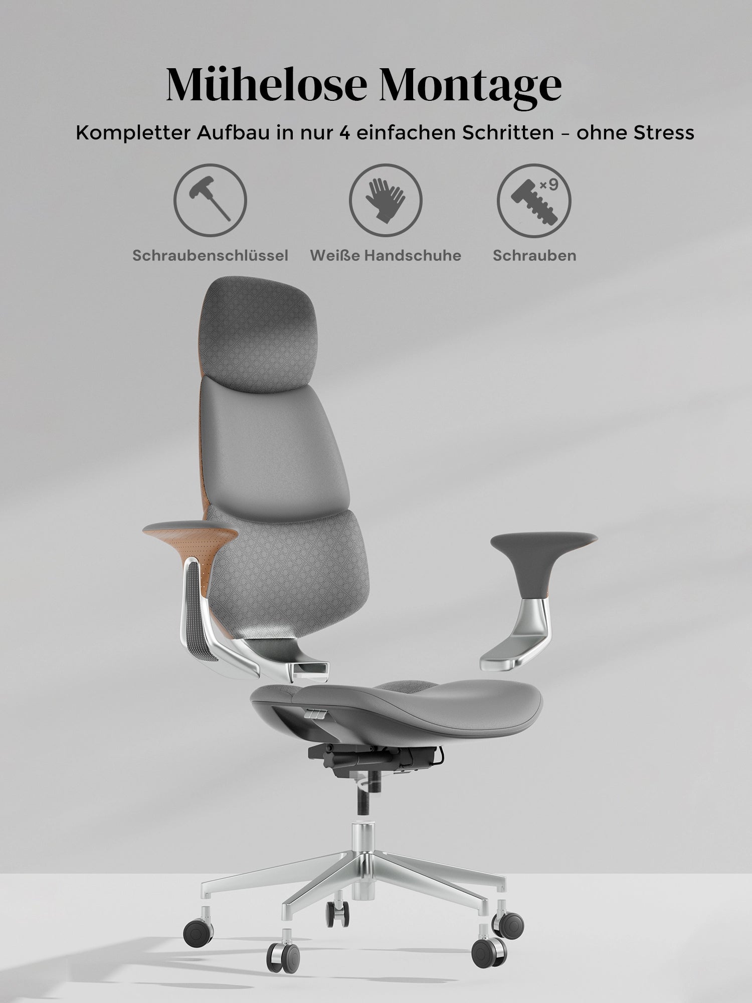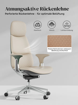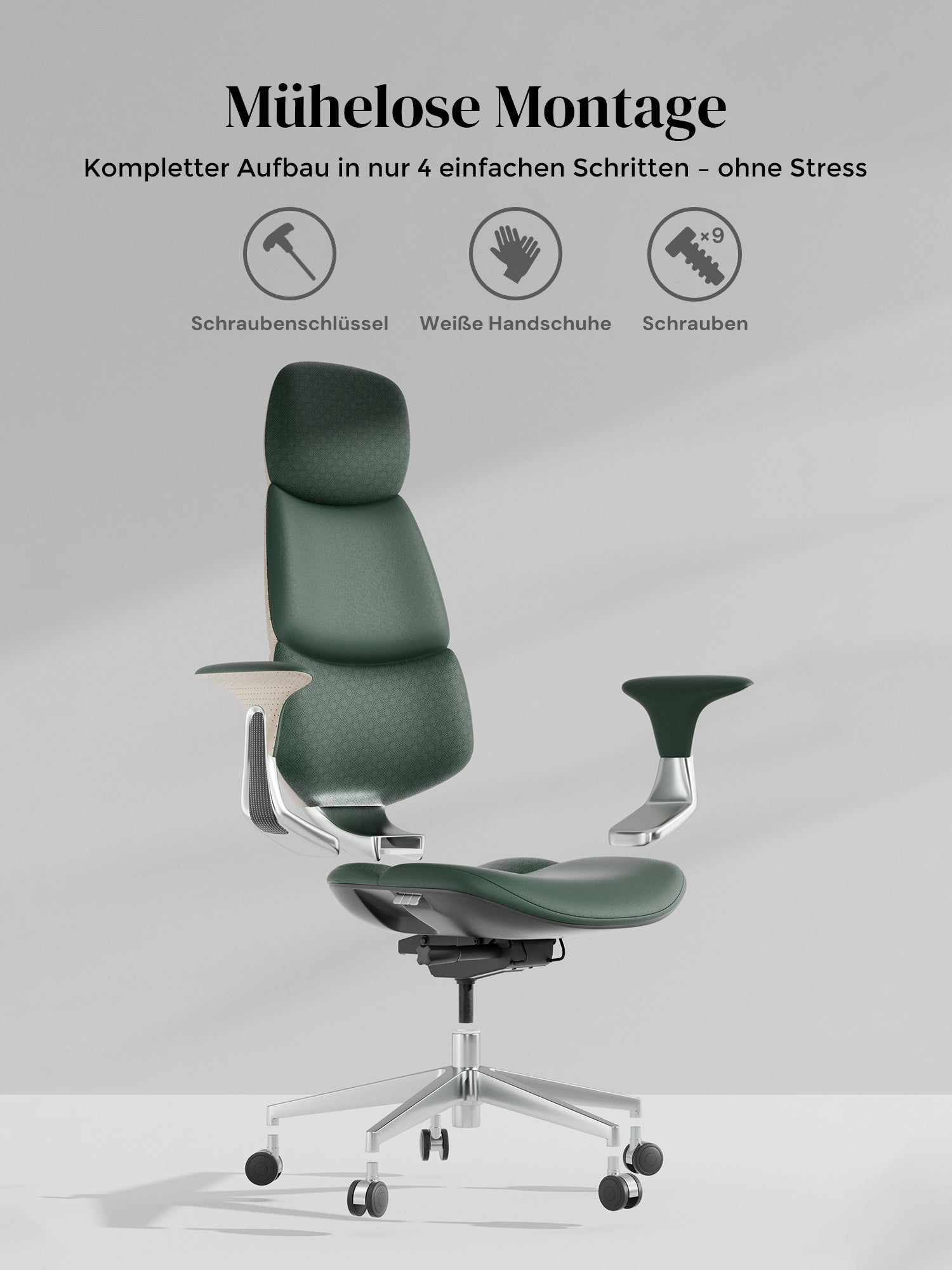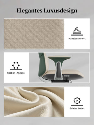 · Rollen: Hochwertige, halb aus Aluminium gefertigte Silent-Rollen, zertifiziert nach SGS / Greenguard Gold / TÜV-geprüft, ergonomisch