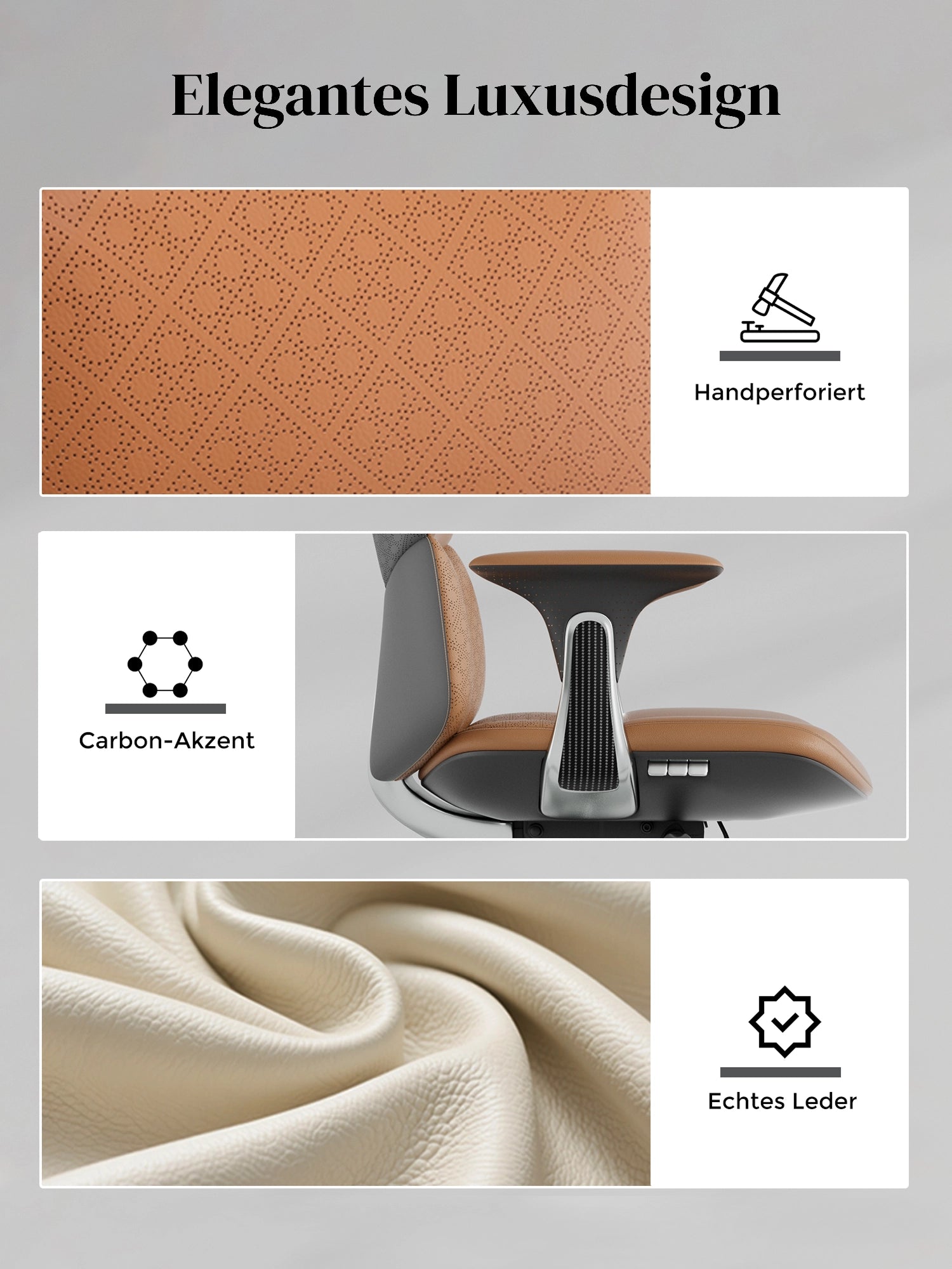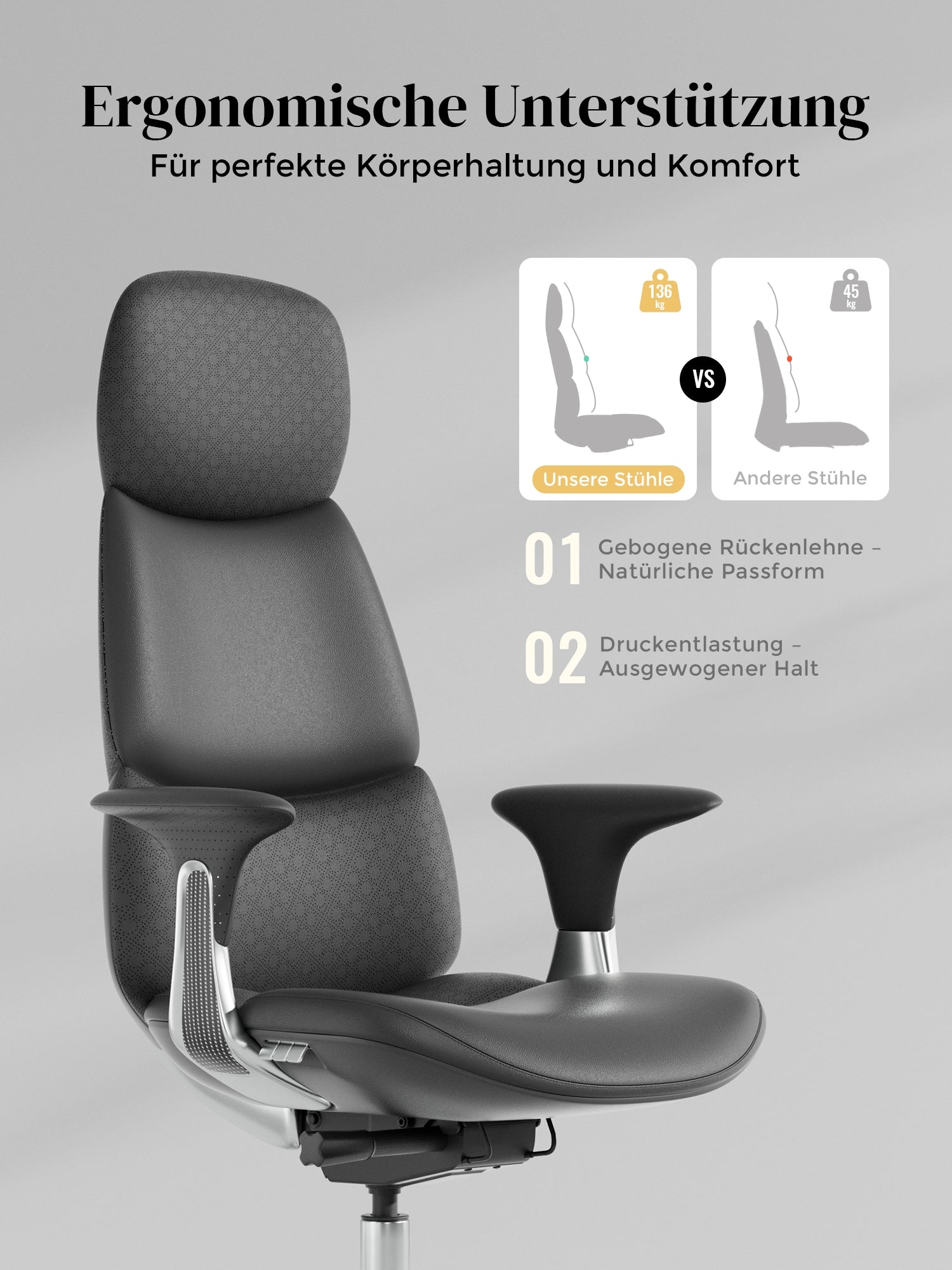 · Gasfeder: Vierstufige Samhongsa-Gasfeder, nahtloses Stahlrohr, gefüllt mit 99,99 % reinem Stickstoff, TÜV- und ISO-zertifiziert, Belastbarkeit bis 136 kg