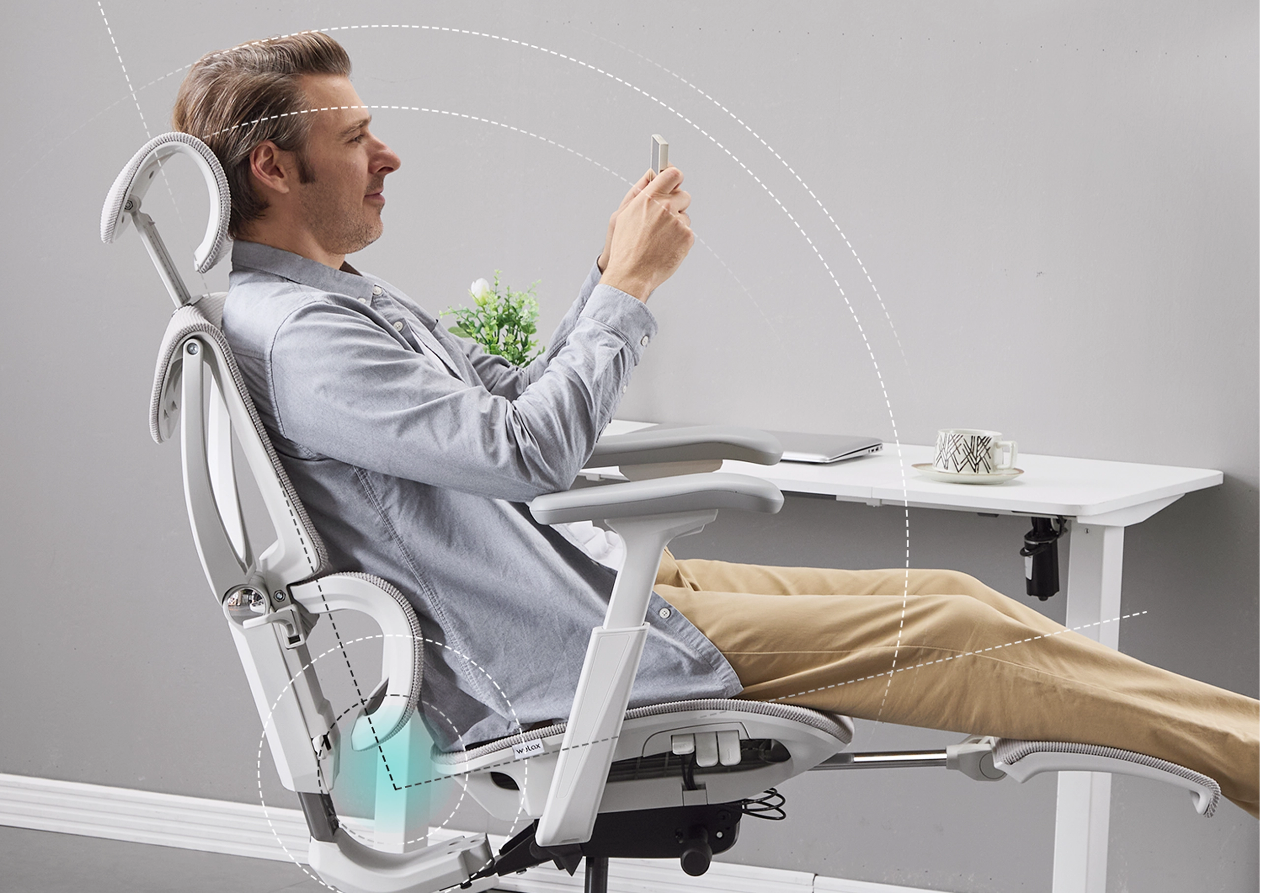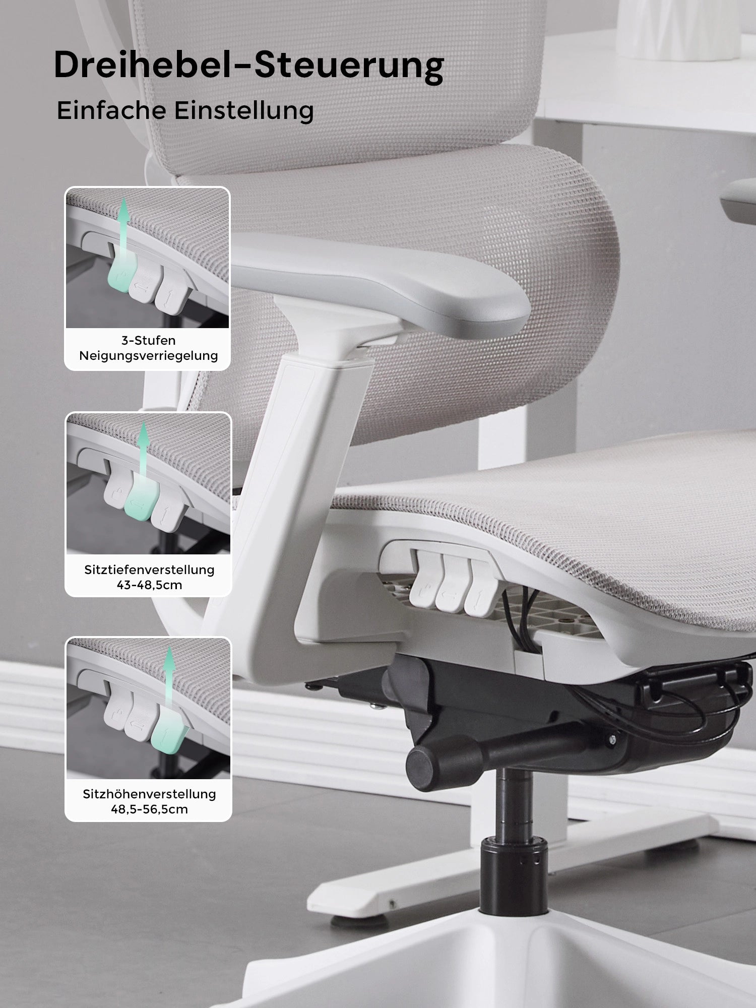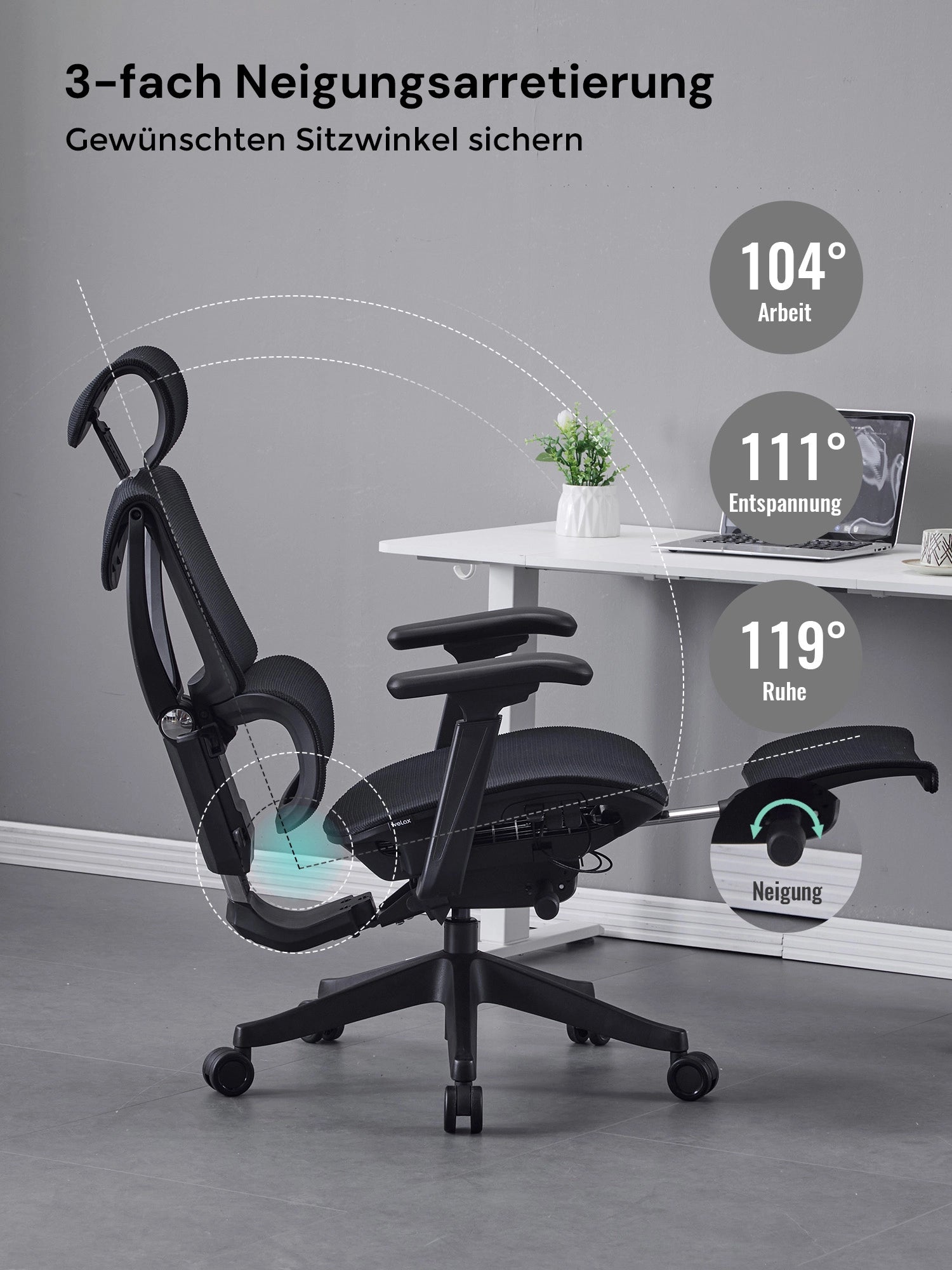 Sitzhöhe, Rückenlehne (95° / 104° / 111° / 119°) und Armlehnen lassen sich mühelos mit nur drei Tasten einstellen. Wechseln Sie blitzschnell zwischen Arbeit und Entspannung.