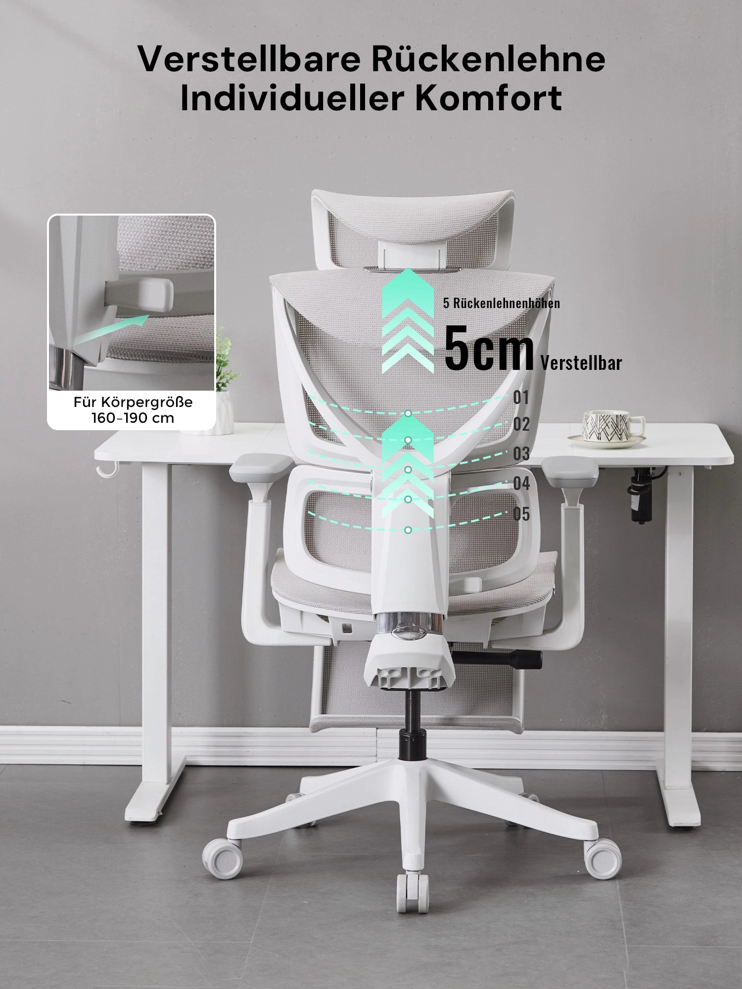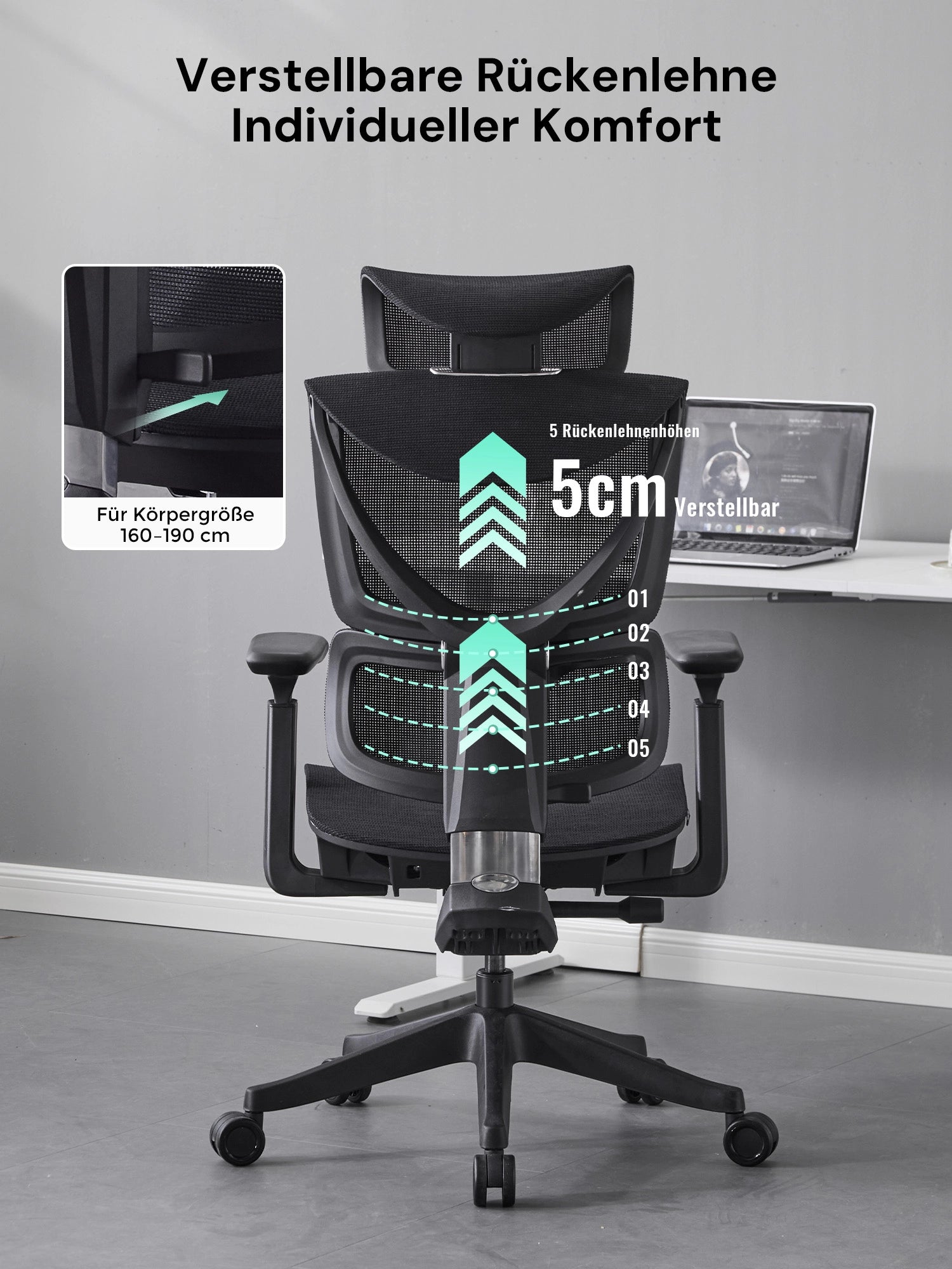 Atmungsaktive Mesh-Rückenlehne mit Lordosenstütze sorgt für optimale Haltung und Belüftung. Kompakt, robust und ideal für Home Office oder kollaborative Arbeitsbereiche.