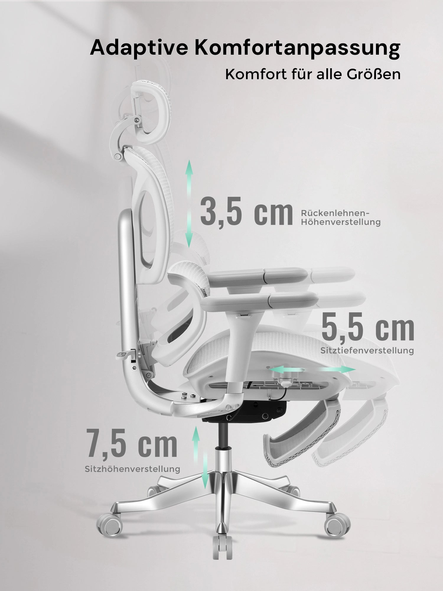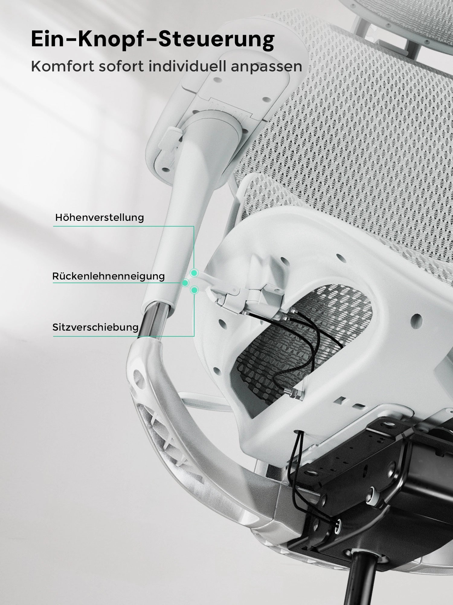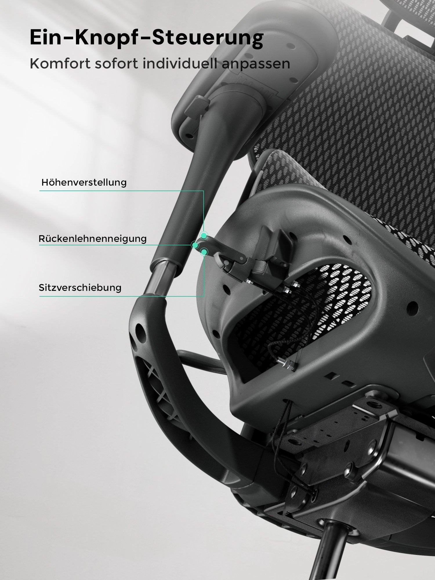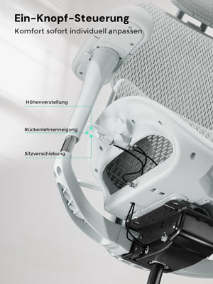 Sitztiefe, Neigungswinkel und Höhe lassen sich bequem mit nur einem Knopf einstellen. Wechseln Sie mühelos zwischen Arbeit und Entspannung – ganz ohne komplizierte Anpassungen.