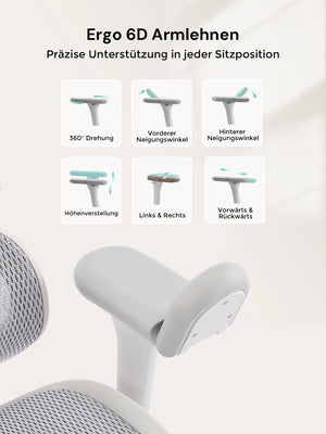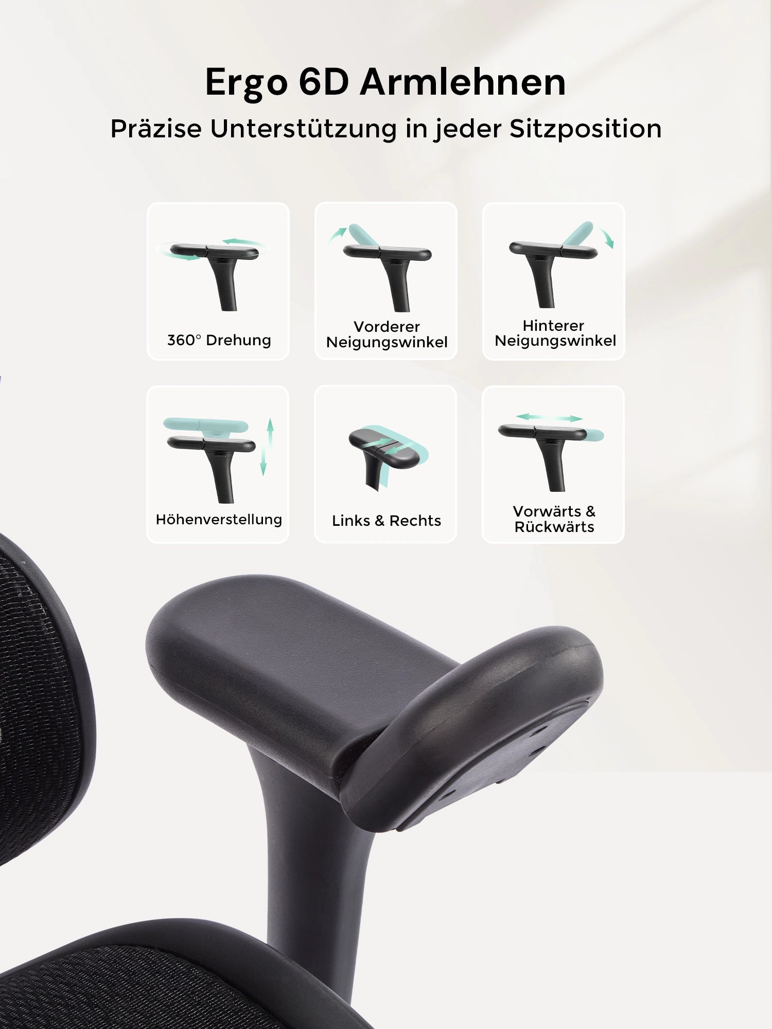 Bewegen Sie die Armlehnen in sechs Richtungen – hoch, runter, vor, zurück, innen und außen. Ideal zum Tippen, für Meetings, Gaming oder Entspannung, wobei Schultern und Handgelenke stets optimal gestützt werden.