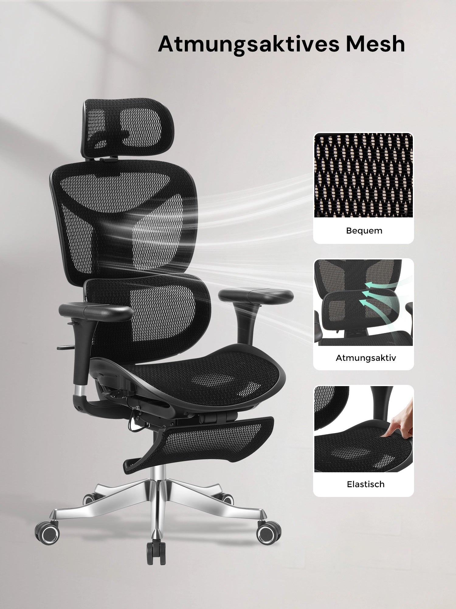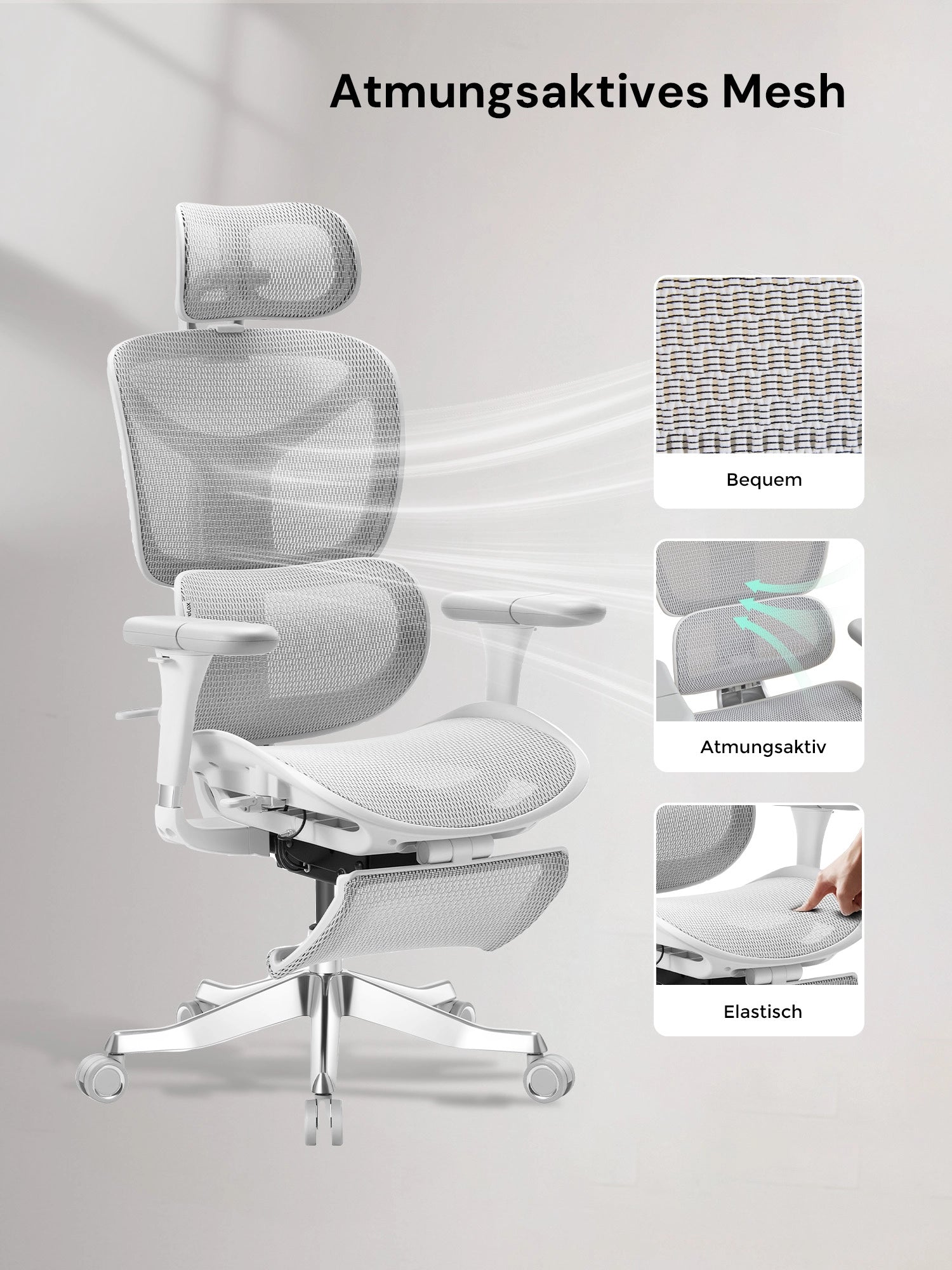 Das in Deutschland importierte Mesh-Material sorgt auch nach langen Stunden für angenehme Belüftung. Die verstärkte Aluminiumlegierungs-Basis garantiert langlebige Stabilität und hohe Belastbarkeit.